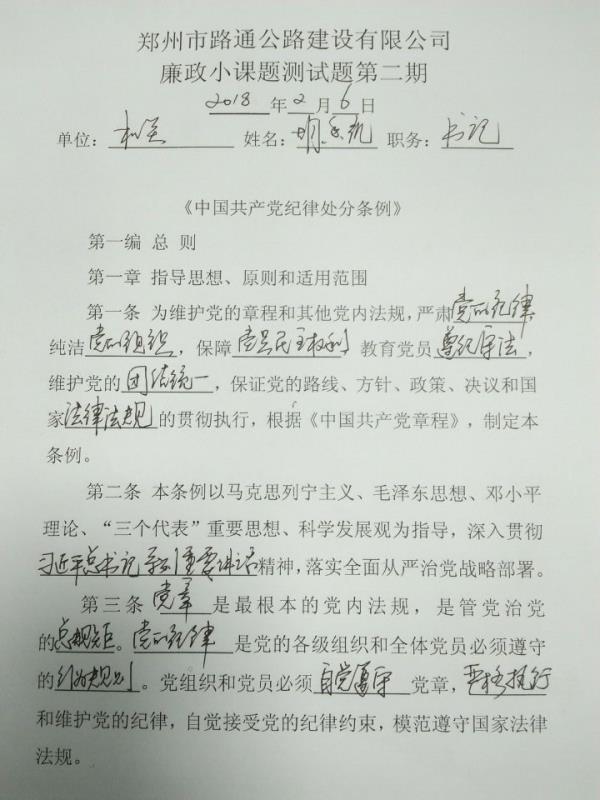 近日,鄭州市路通公司黨委在公司周例會的廉政小課堂上“正式推出”一項(xiàng)新舉措——廉政知識專項(xiàng)測試。測試內(nèi)容涉及中央八項(xiàng)規(guī)定精神和省市相關(guān)規(guī)定,聚焦各類黨紀(jì)政紀(jì)條例法規(guī)?荚嚥扇¢]卷的形式,對與會的公司領(lǐng)導(dǎo)、中層干部、直屬單位的領(lǐng)導(dǎo)班子進(jìn)行一次嚴(yán)格的黨風(fēng)廉政教育。試卷由公司紀(jì)委統(tǒng)一評分,并進(jìn)行公示,成績在80分以下人員必須補(bǔ)考。